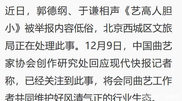 德云社遭举报 一开始,谁都没把举报当回事,说实话,德云社被投诉,已经不是新闻了,这些年,从“低俗”“三俗”,到“段子越界”,再到“演员翻车”,几乎每隔一段时间,就要来一轮。 所以当《艺高人胆小》被举报的时候,很多老观众的第一反应只有一句:“又来了。”段子是老段子,风格是老风格,郭德纲还是那个郭德纲。