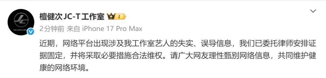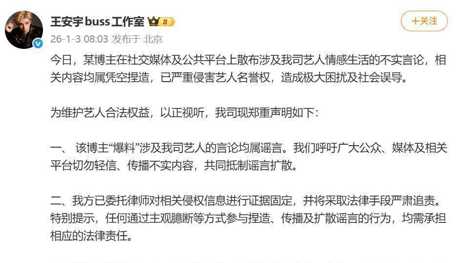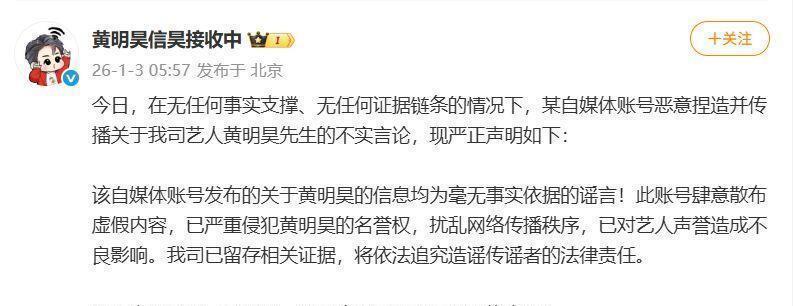林更新那边则比较温和,但也毫不含糊:我们已经取证,律师已经安排上了。如果对方真的身体有病,希望她早日康复,顺便给大家拜个早年。黄明昊的团队态度直接:“关于黄明昊的爆料全是无中生有的谣言,证据我们都留好了,该走法律途径就走。”檀健次工作室也是一样,明确表示要走法务流程,呼吁网友擦亮眼睛,不要随便相信网上的瓜。