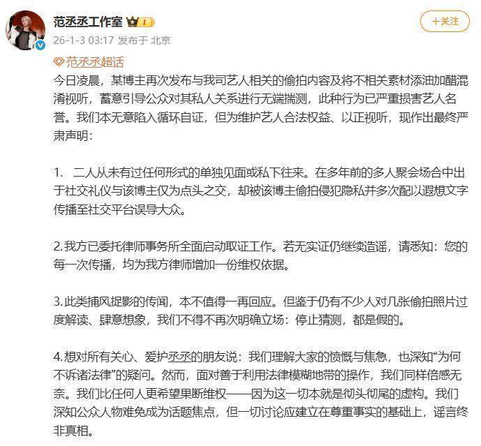 说实话,这种深夜放瓜,谁能睡得着?1月3日凌晨,各家明星工作室连夜上线,纷纷甩出律师函、声明,场面堪比春晚抢红包。鹿晗那边火速两条声明,直接表态:关于鹿晗私生活的这些离谱谣言,我们已经收集证据,正在走法律程序,大家别再瞎传瞎造了,赶紧把相关内容删了。范丞丞的回应也很硬气,说跟这位女博主根本没单独见过面,顶多就是多年前聚会场合点头之交,结果却被偷拍,还配上各种暧昧文字,误导大众,简直离谱。